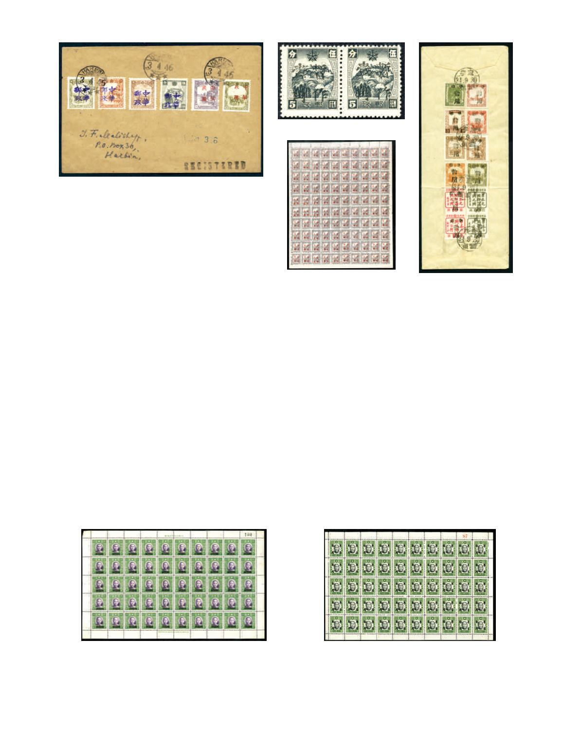 1946 Local overprint Harbin wood chop handstamped, 20f, 30f 50f and 1Y in complete sheets, 20f x 3 sheets and