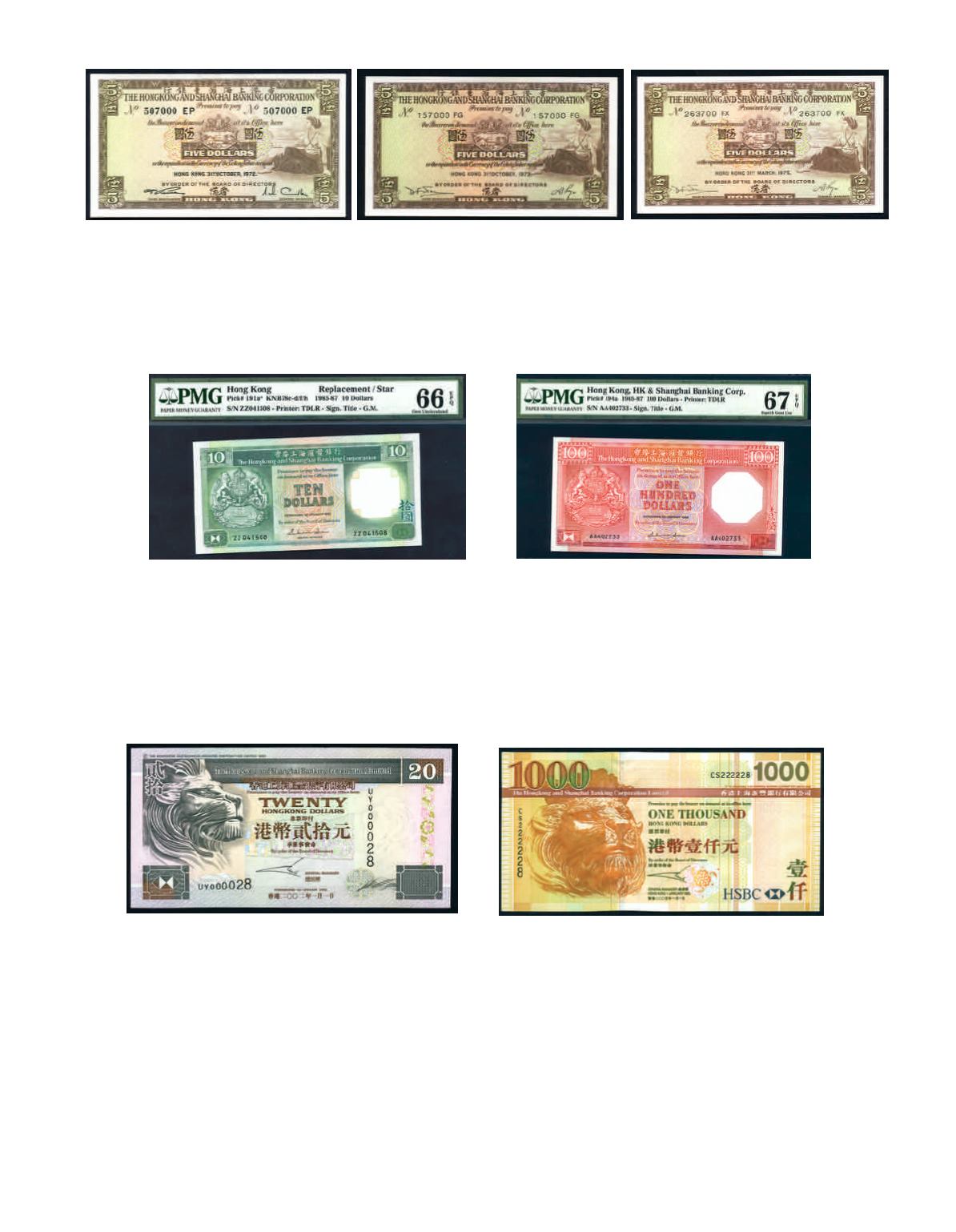 Hong Kong and Shanghai Banking Corporation Ltd., 2005 $20 No. HB222228, 2008 $50 No. DH22228, 2003 $100 No. EU