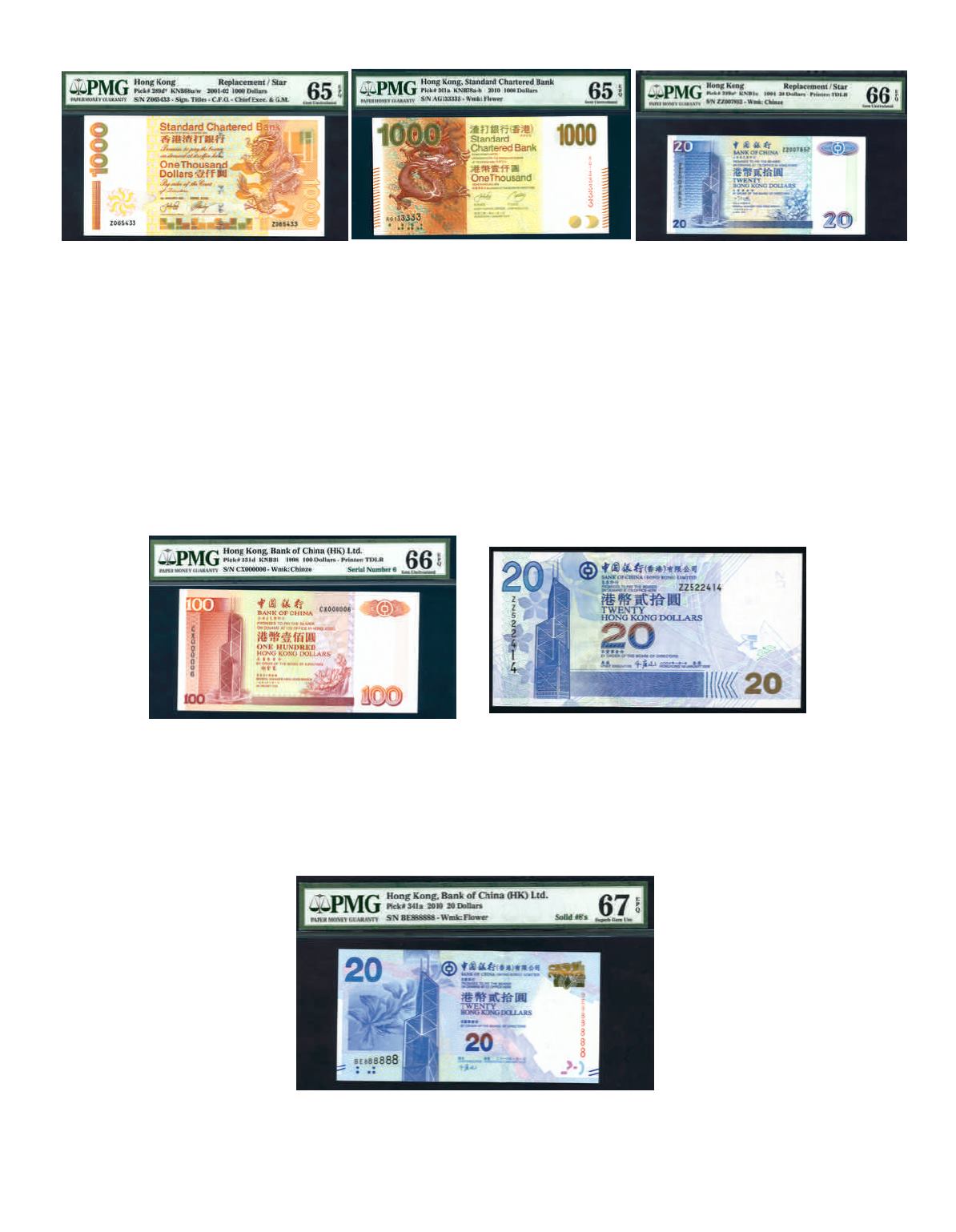 The Bank of China (Hong Kong) 2000 $20 No.BN000006, 1998 $100 No.CX000006 and 2012 $100 No.CL000006, all EPQ66.