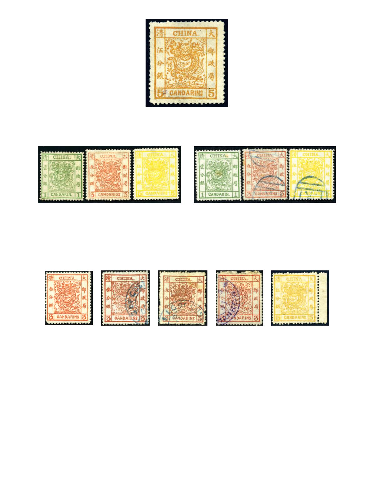 1883 Large Dragon thick paper clean cut perf. 1 cand to 5 cands complete set of 3, 1 cand unused and no gum, with 2 dirt marks