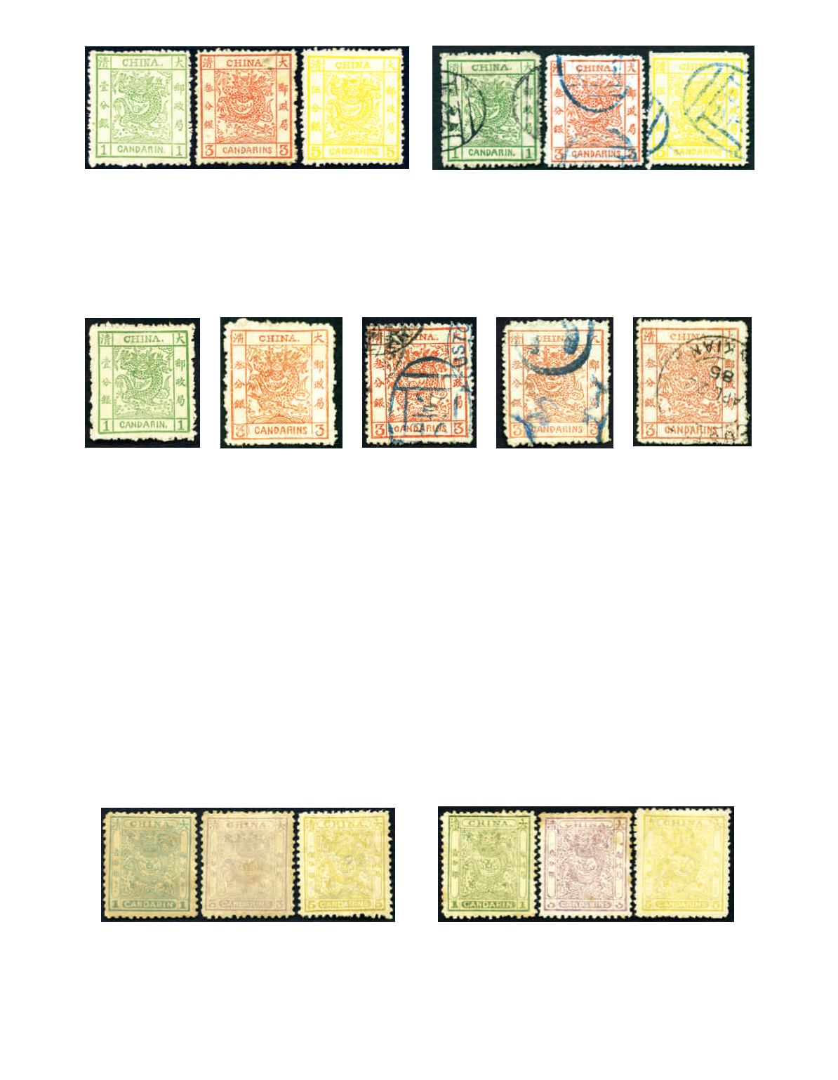 1885 Large Dragon thick paper rough perf. 1 cand to 5 cands complete set of 3, all tied by seal chop, very fine used. Chan 10-12.