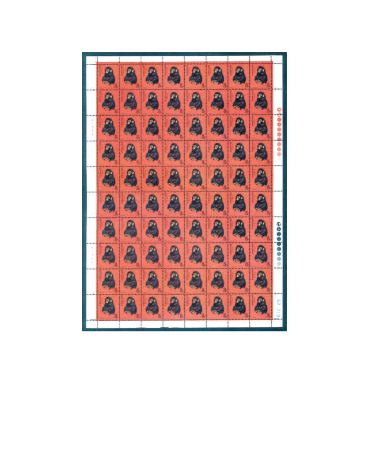 1980 (T46) Year of the Monkey complete sheet of 80, plate no. '62219', toned on both sides but gold colour is still shinny. Photo