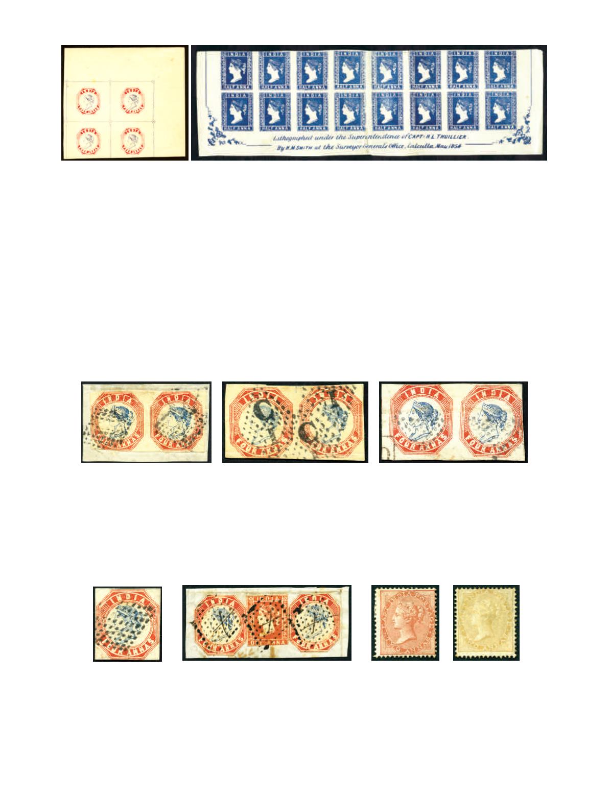 1854 India 4a indigo and red essay head print, size 30 x 32 mm, with printed 'Specimen' in black on reverse. Photo