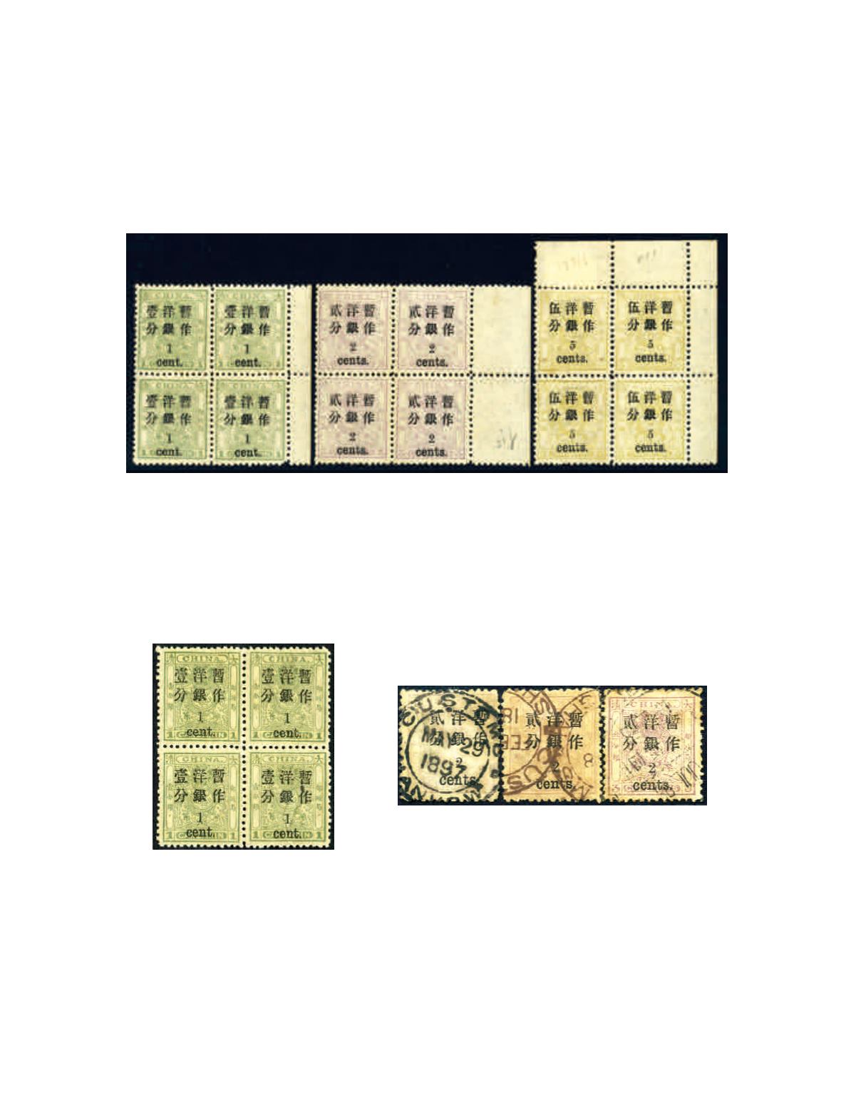 1897 Small Dragon surcharged 1c on 1 cand to 5c on 5 cands complete set in marginal blocks of 4, mint full original gum never
