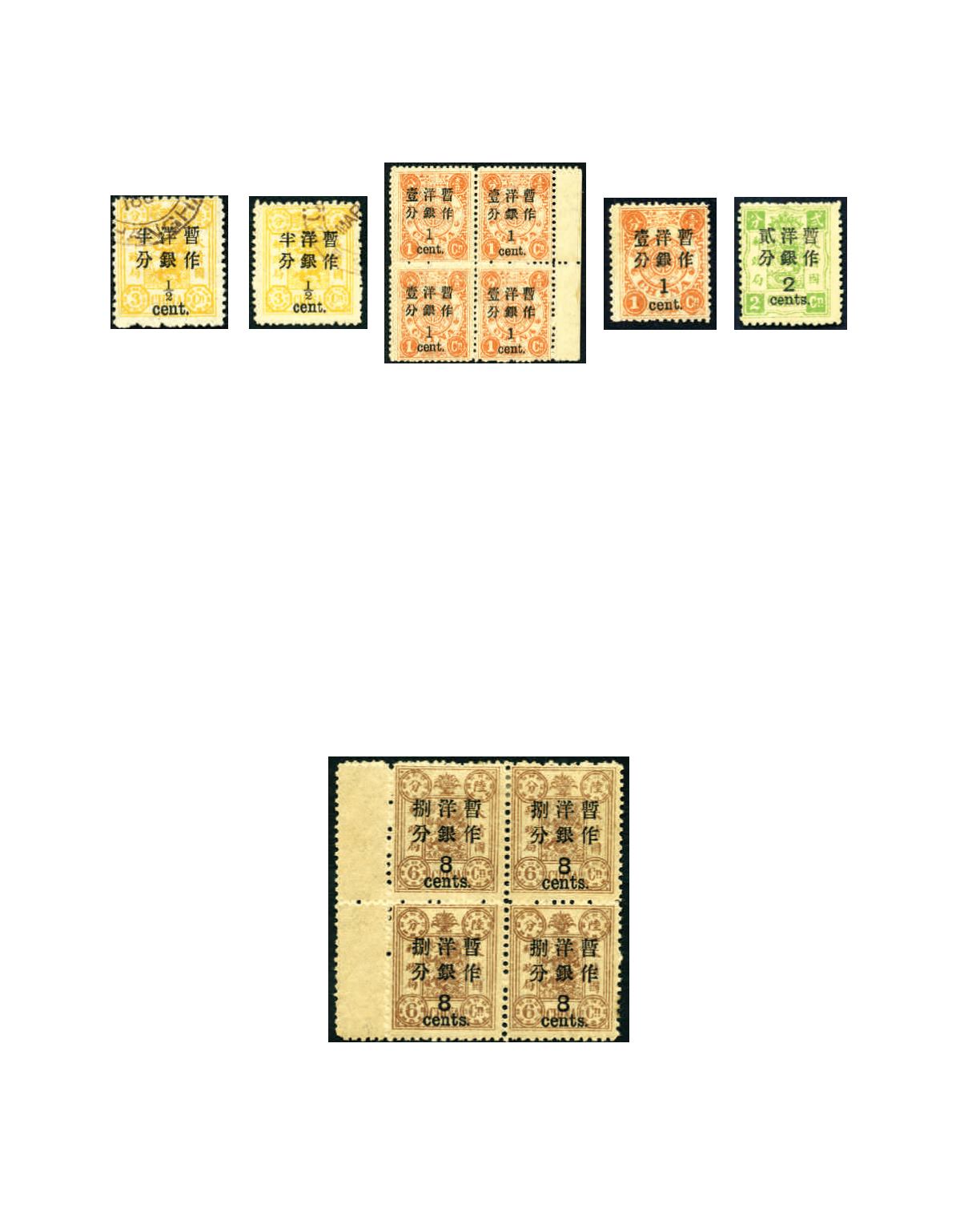 1897 Dowager large figures surcharged 2.50mm on first printing, 8c on 6 cands chocolate block of 4 with left side sheet margin,