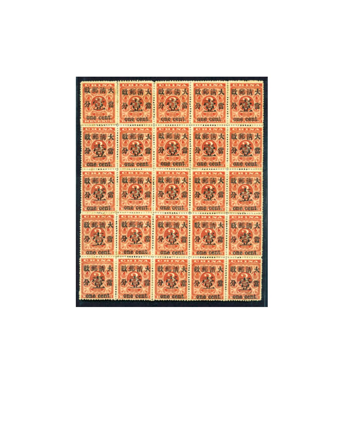 1897 Large figures surcharged 1c on 3c, complete pane of 25, with constant varieties, Large Box etc, with hinged paper on