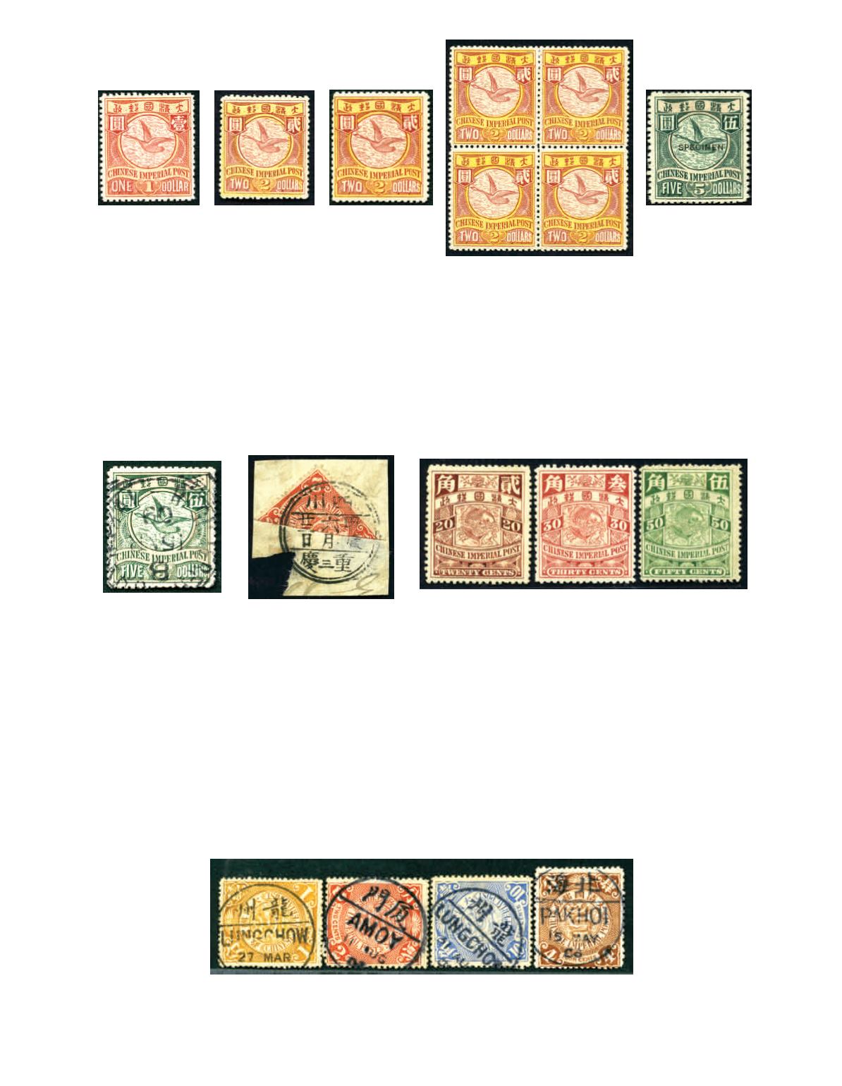 A small selection of low values Coiling Dragon x 32, all tied by bilingual cds, nearly complete strike on stamps, including Amoy,