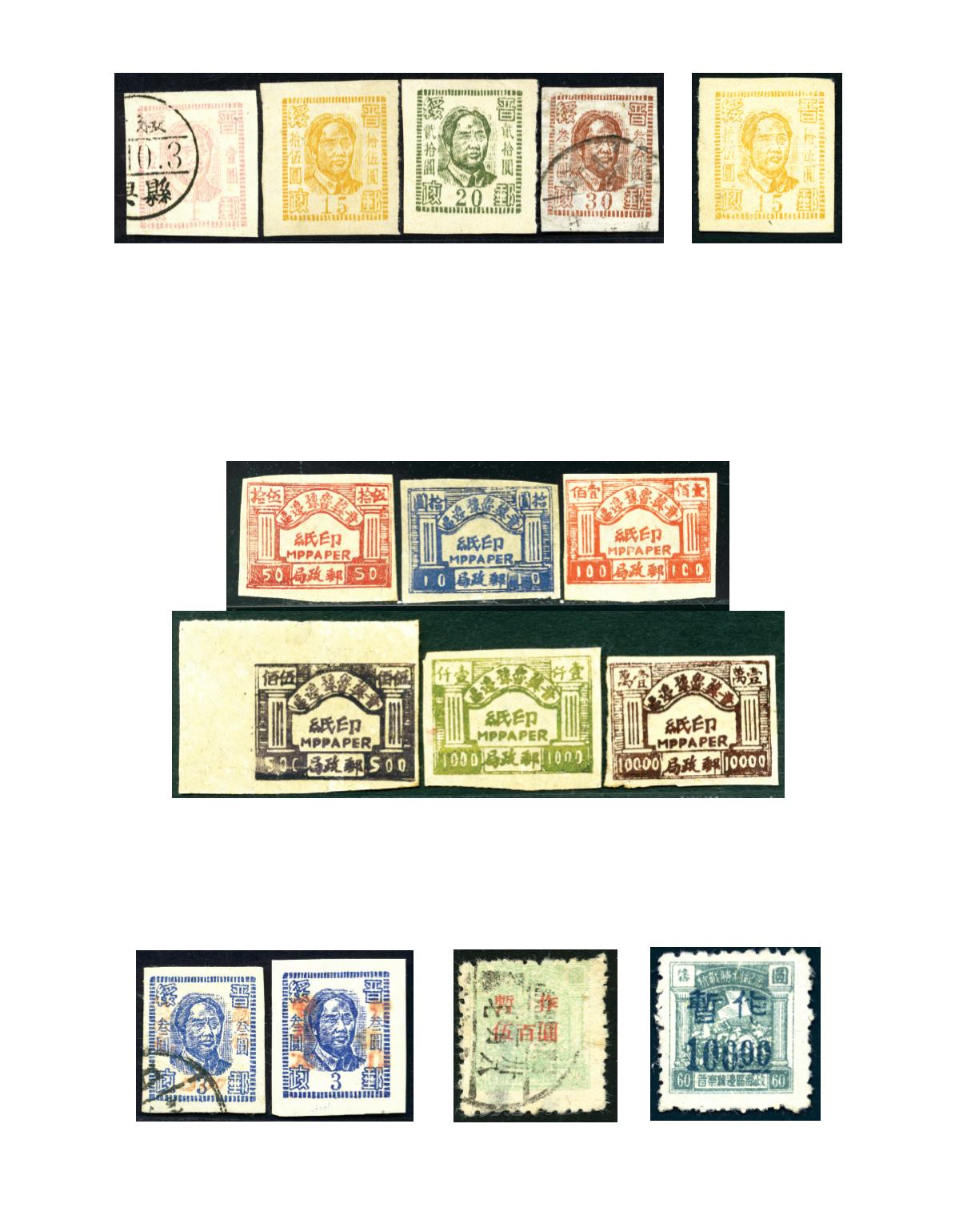 964 Shansi-Hopeh-Shantung-Honan Border, Money Order Stamps short set of 6, $10 blus, $50 red, $100 rose red, $500 purple,