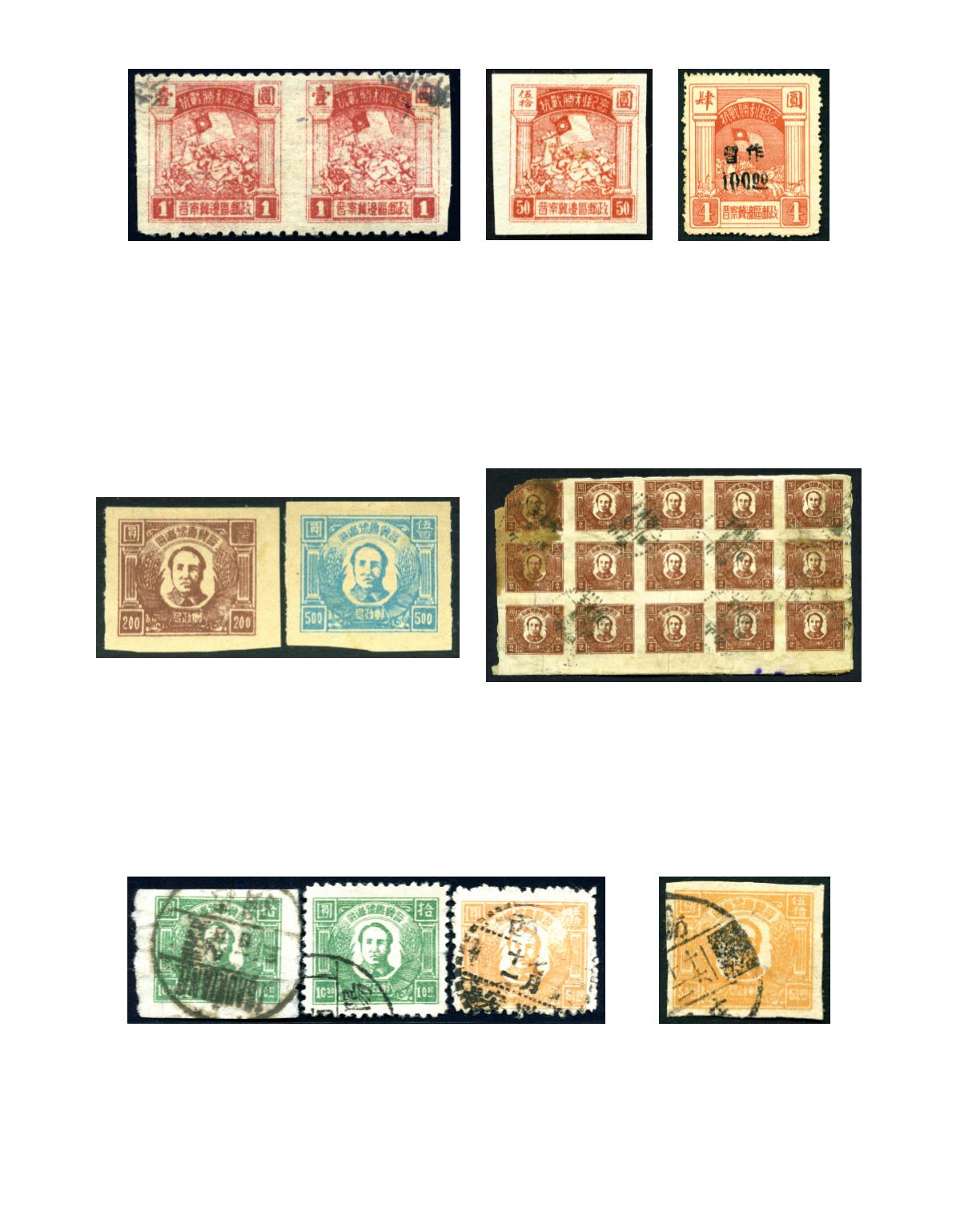 1947 Chairman Mao with Harvest design, $10 emerald x 2, one with perf. 10 and $50 orange perf. 10, all used.