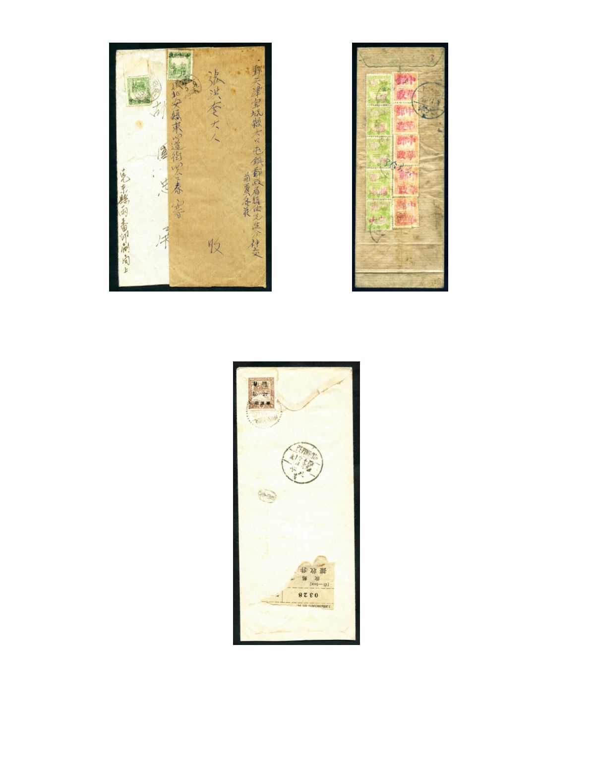4f x 5 olive green and 6f carmine x 6 (surface faded), with bilingual 'TIENTSIN' arrival cds, some creasing. Photo