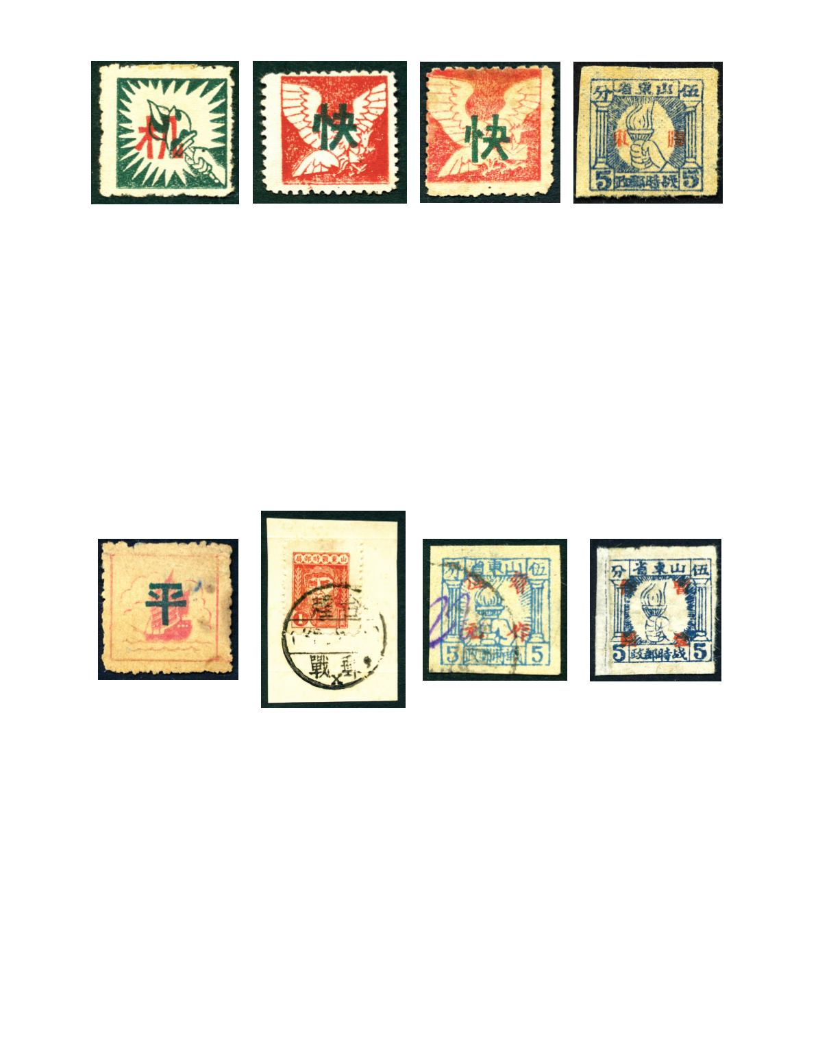 1945 Shantung Wartime Post, ChuTeh, imperf., 5c., 10c., 50c. grey-green, $1 orange-yellow, $3 violet, perf., 5c. light blue