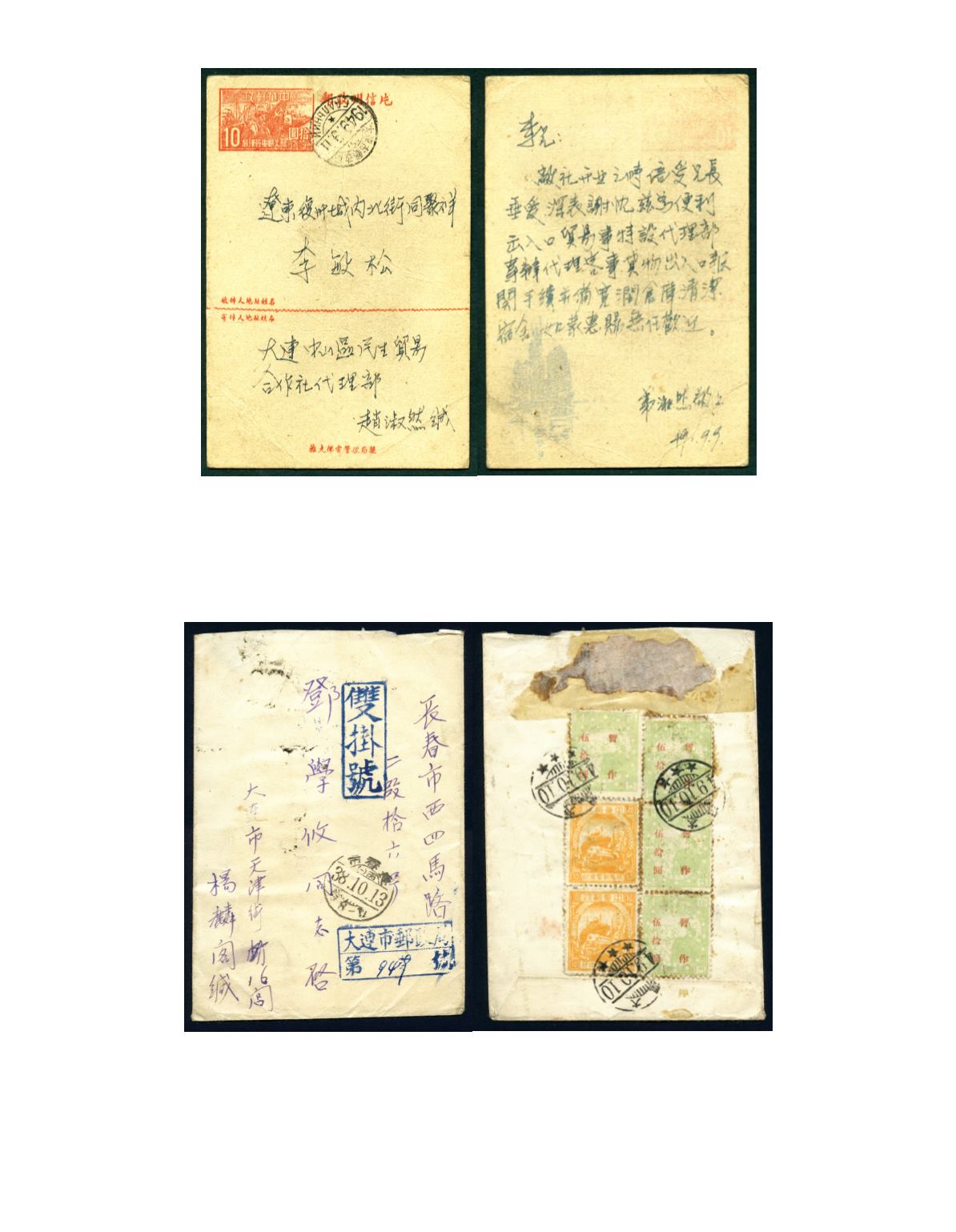 1949 (10 Oct.) A cover from Dairen double reg. to Changchun, on front tied by the 'CHANGCHUN/13.10.49' arrival cds and
