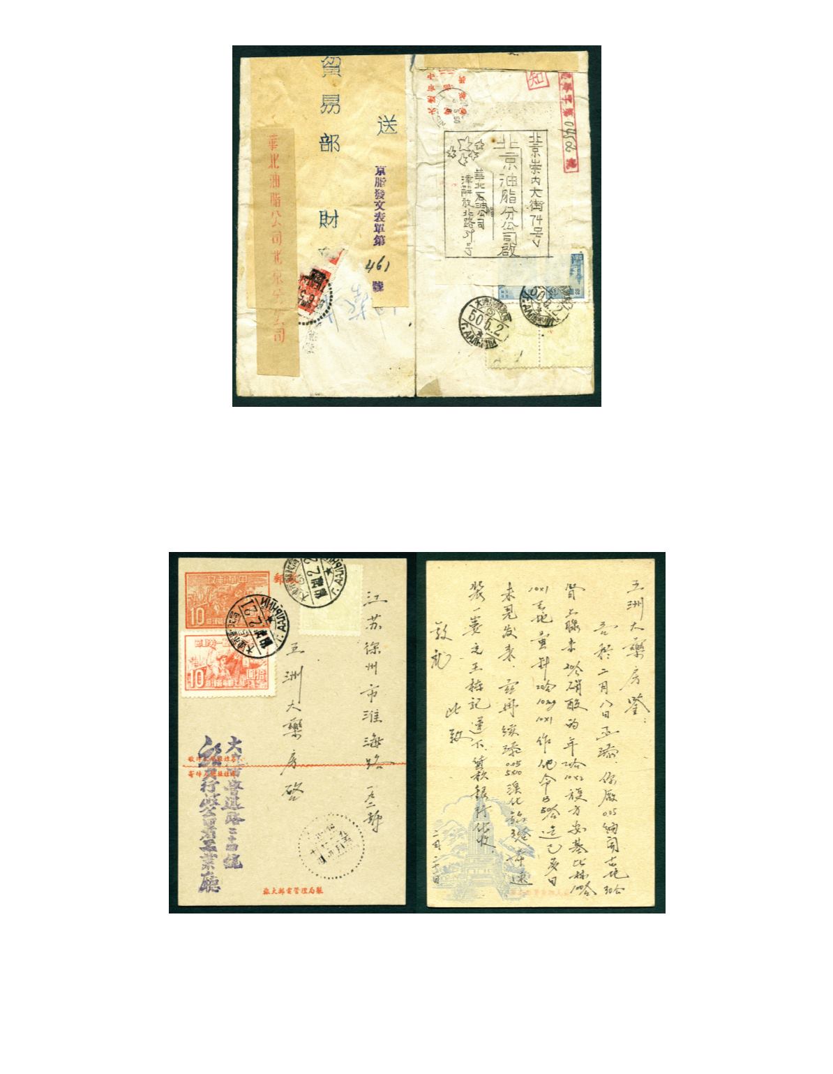 pair (Yang AD49) and Tien An Men 'For used in Darian' $10 blue in pair (Yang AD69) tied by bilingual 'Darian City Post Office'