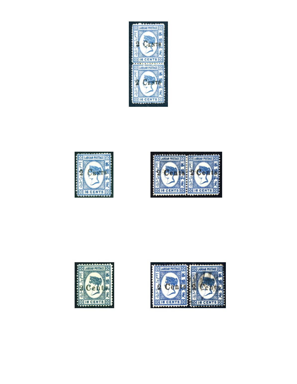 1885 '2 CENTS' surcharge on 16c blue vertical pair (positions 5/10), mint no gum, perforations reinforced with hinge.