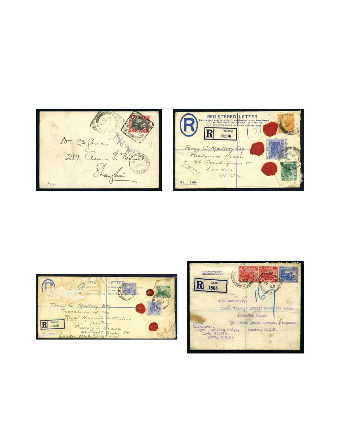 1923 (9 Nov.) A Federated Malay States, Tiger 10c blue, size G registered envelope from Taiping to London, bearing 2c green and