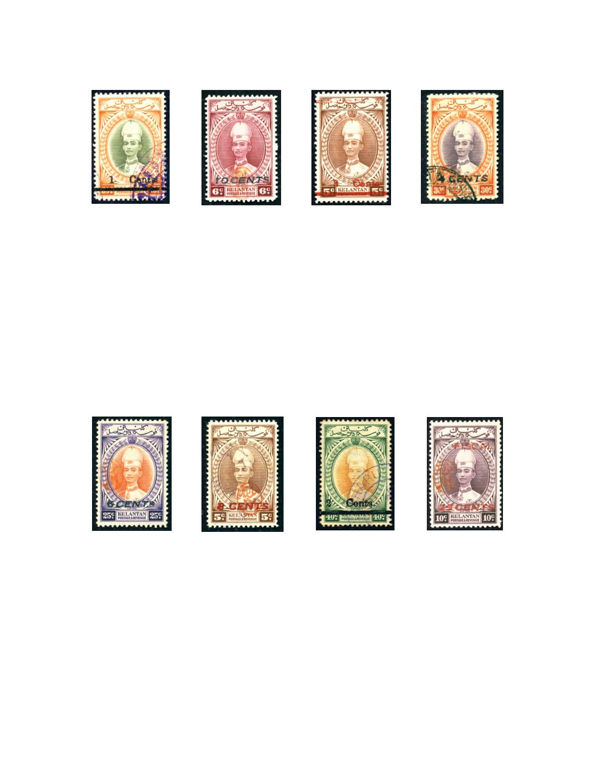 1942 A small range of surcharges on Kelantan issues, 8c on 5c red brown, 30c on 4c scarlet, 50c on 1c grey olive and yellow,