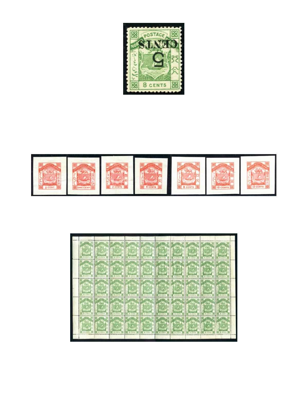 1886-87 issue 1/2 cents, 1 cents, 2 cents, 4 cents, 8 cents, 10 cents and unissued 12 cents in scarlet, all cut from a composite die