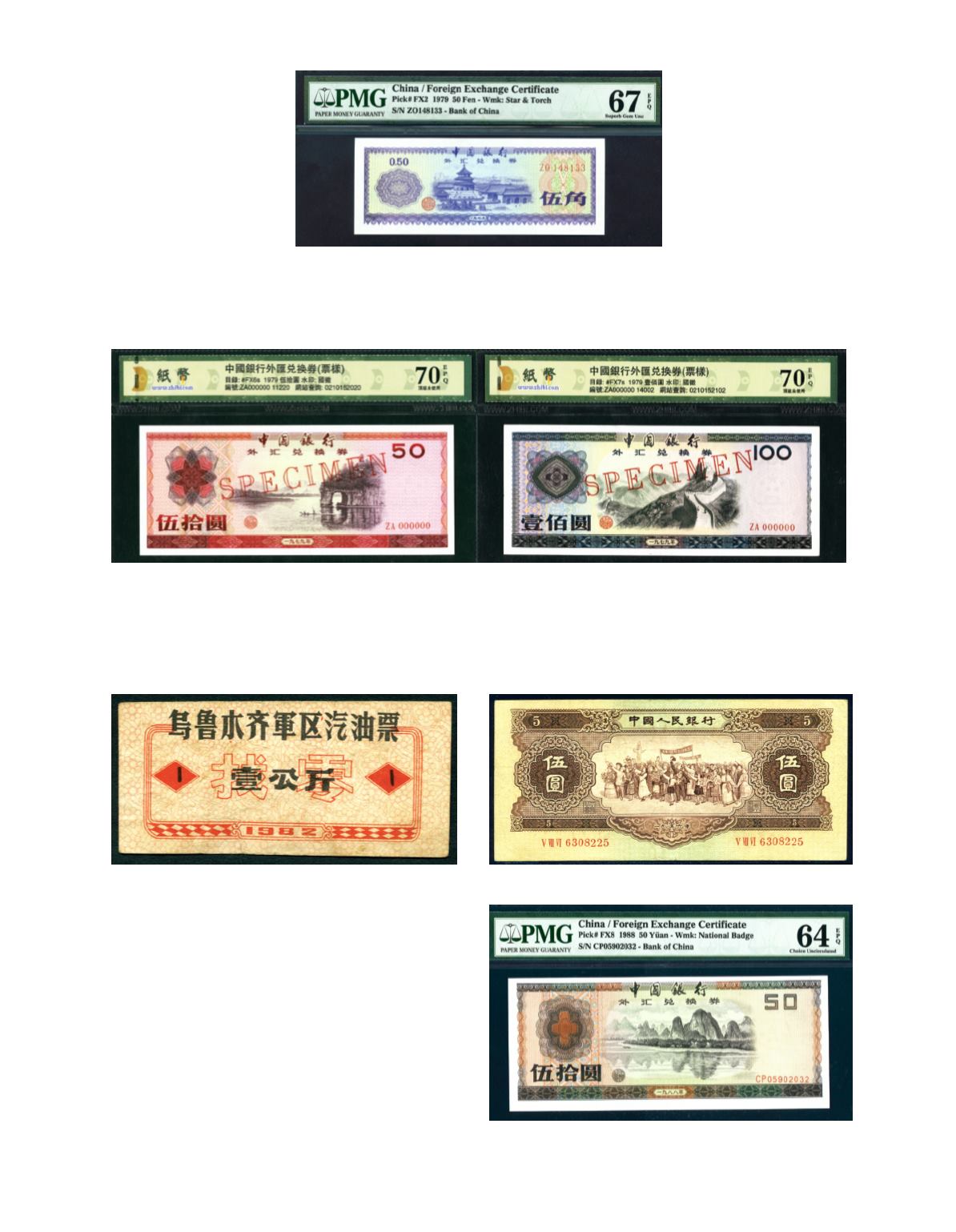 The People Bank of China/Foreign Exchange Certificate, 50 cents no.Z0148133 EPQ67 and 10 yuan no.ZP895236 EPQ65. Photo