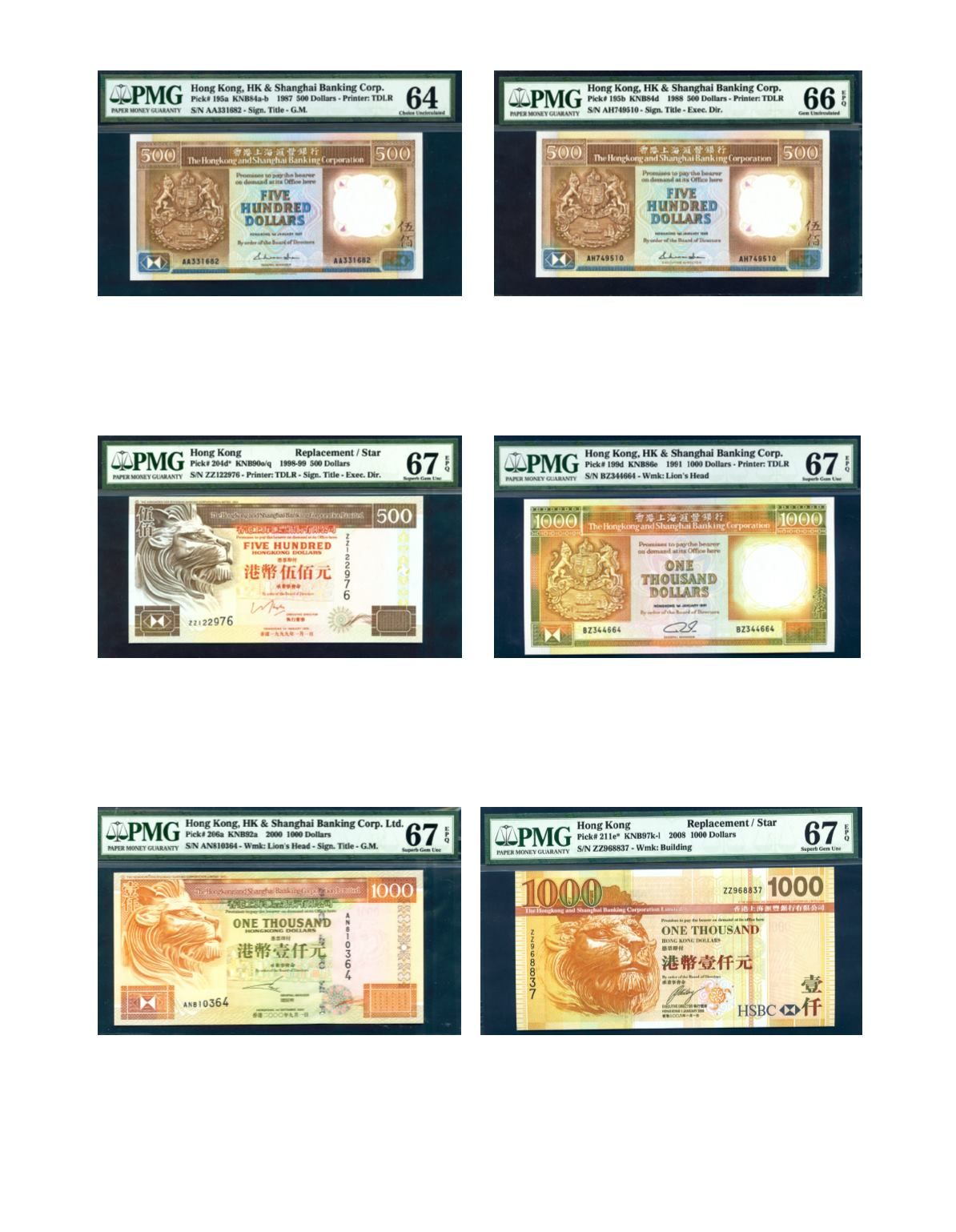 The Hong Kong and Shanghai Banking Corporation Ltd. 1988. $500 No. AH749510. PMG 66 EPQ. Photo
