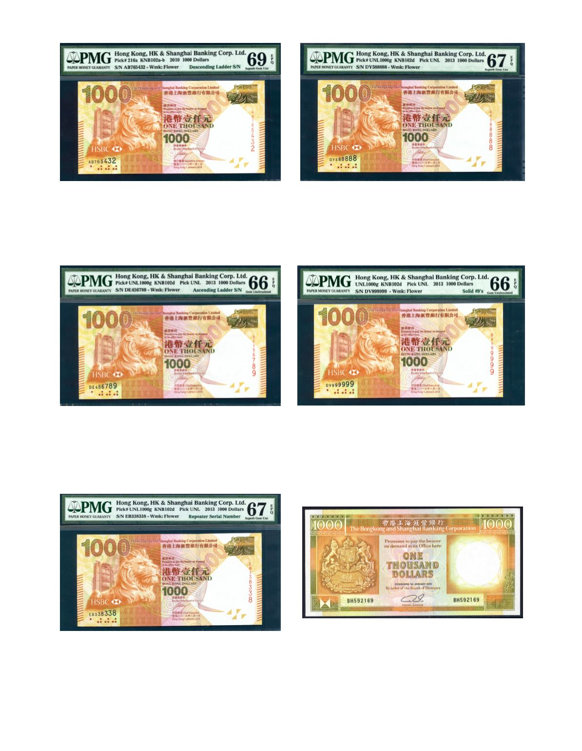 The Hong Kong and Shanghai Banking Corporation Ltd. 2010. $1000 No. 765432. PMG, 69 EPQ. Photo