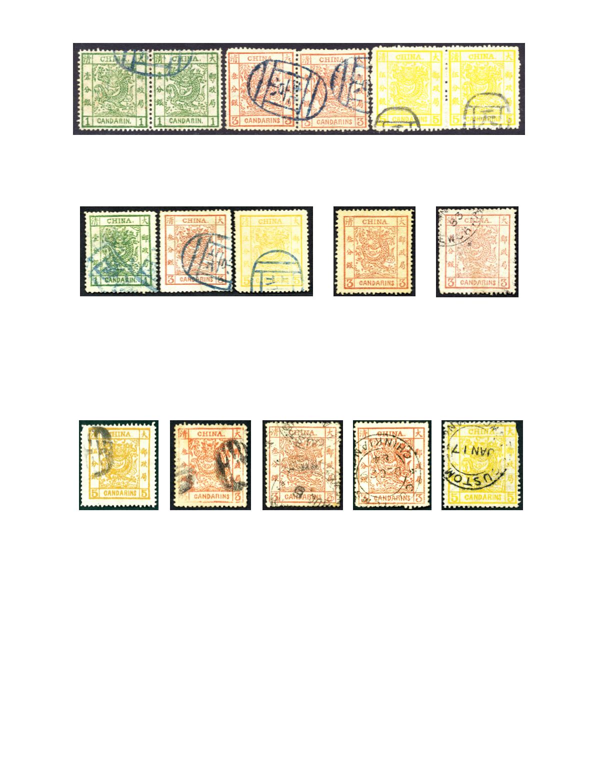 1878 Large Dragon Thin paper 1 cand green and 3 cands brown red, both horizontal pair, and 1885 thick paper rough perf. 5 cands