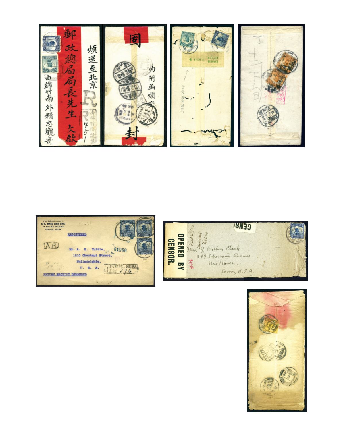 1918 (16 Jan.) A cover from Peking reg. to USA, bearing Peking 1st print Junk 10c x 3, tied by