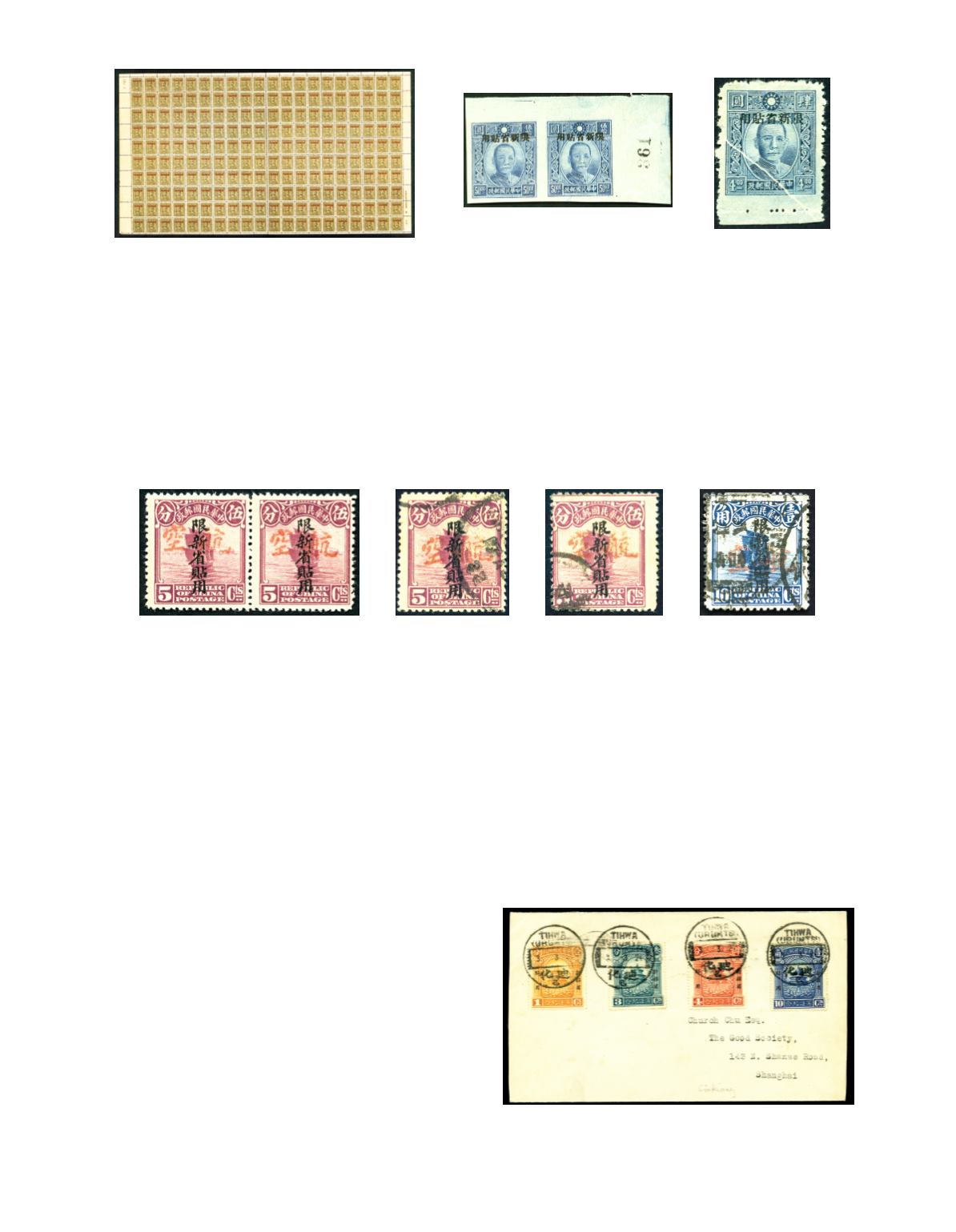 A small collection of 'For use in Sinkiang' overprint on junk issues, with Junk 1/2c block of 60, tied by bilingual 'TIHWAH' cds,