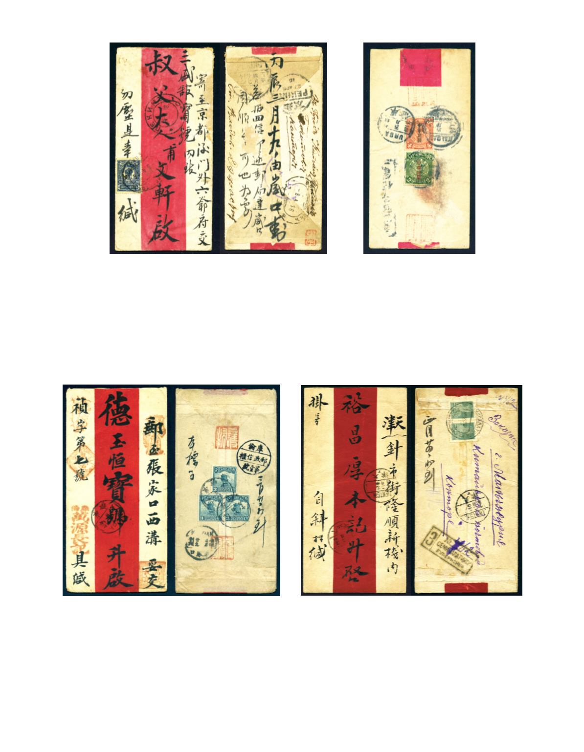 1918 (19 Apr.) A red band cover from Urga to Kalgan, on reverse bearing Peking 2nd print Junk 3c blue green x 3, tied by