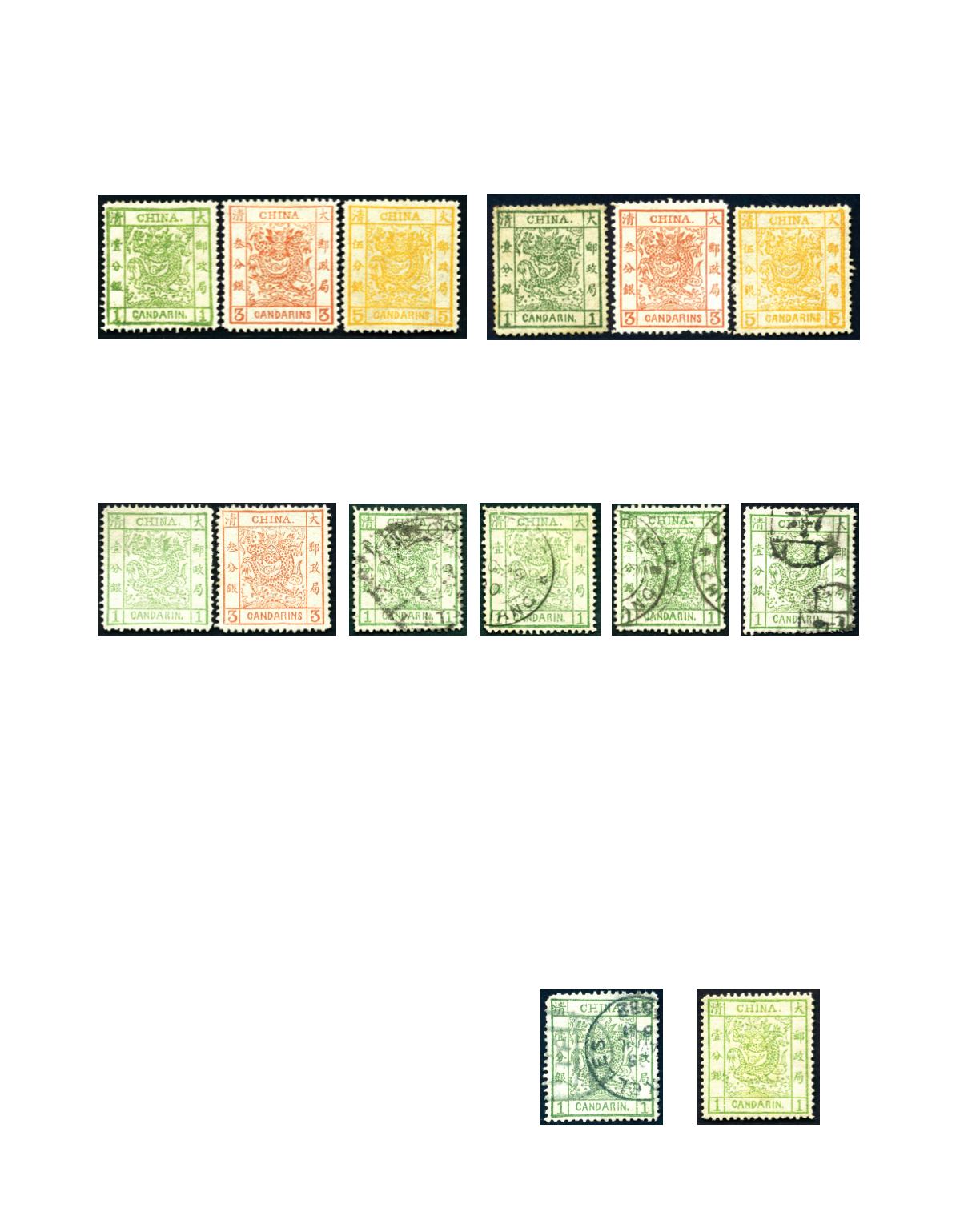1878 Large Dragon thin paper, 1 cand yellow green and 3 cands brown red, both mint and no gum. Chan 1-2. Photo