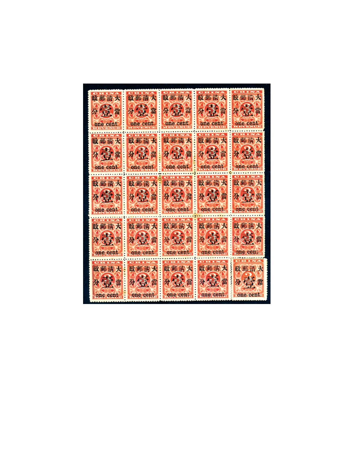 1897 Large figures surcharged 1c on 3c large block of 25, bottom right stamp is rejoined, with constant varieties, unmounted mint