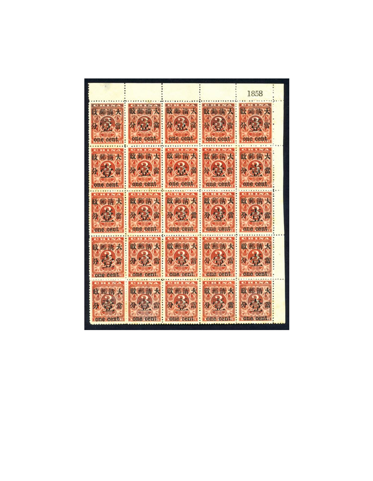 1897 Large figures surcharged 1c on 3c top right pane of 25, with plate number 1858, the bottom left stamp is rejoined, and thin at