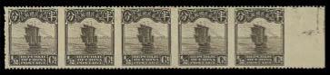 1922-23 Second Peking Junk, 1/2c sepia, horizontal strip of 5 with right margin, imperforate vertically and right margin, mint, full