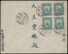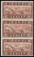 1942 “Limited For Use in Sinkiang Province” woodchop handstamp in red on Thrift Movement issue, 21c brown, vertical strip of