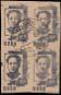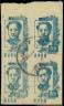 1944 Shantung Wartime Post, Chairman Mao issue, 1st print, newsprint, 5c deep blue, imperf. block of 4, used with red hand-filled