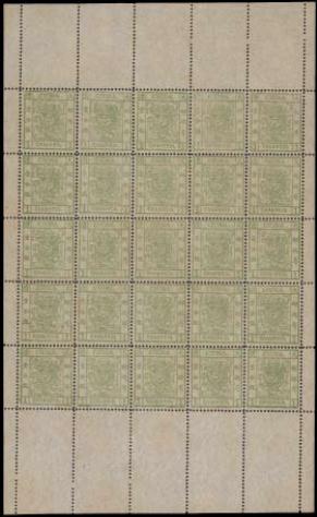 1878 Large Dragon thin paper, 1cd yellow green setting I complete sheet of 25 (5 x 5), toned on both sides. Chan 1a. Photo