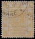 1878 Large Dragon thin paper, 5cds orange, used with part of 'Postage Paid, Don't Demand, Don't Pay' frame black chop, missing