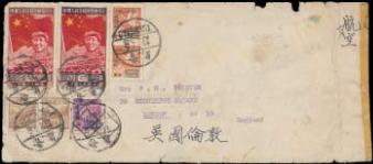1950 (18 Sept.) airmail cover from Peking to London via Canton and forwarded in Hong Kong, f.w. 1950 Surch. on Dr. SYS