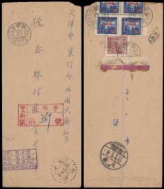 1951.10.18 arrival cds, on front with same Kowpantze cds, another Tientsin cds of same date, also a boxed "Kowpangtze Double