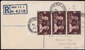 1937 (30 July) Registered cover from Shanghai to England, franked on front with G.B. 1937 Coronation 1-1/2d, vertical strip of 3,