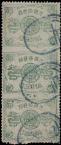 1894 Dowager 1st print, 9cds dull green vert. strip of 3, tied by Seal chop in blue x 3, very fine used. Chan 28. Photo