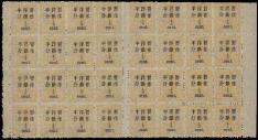1897 Dowager Large figure surcharged narrow space, 1/2c on 3cds pale chrome large block of 32 with sheet margin. Very fresh.