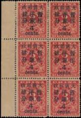 1897 Red Revenue. Large figures surch. 4c on 3c block of 6 with left margin sheet, small part o.g. and gum disturb, 2nd row horiz.