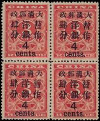 Large Figures 4c on 3c block of 4 mint full original gum with small patches missing, very fresh colour. From the collection of Huang