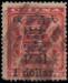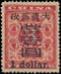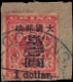 1897 Red Revenue. Large char. $1 on 3c. Used on piece with blue 'WOOSUNG' dollar chop. Toned. Very scarce used. Chan 90.