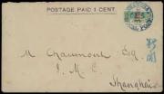 1893 (5 Sept.) A printed Postage Paid 1 Cent cover to Shanghai local, bearing half stamp surcharged in blue 1c on half 2 cents green, tied by