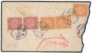 chop in black, on reverse bearing Coiling Dragon 1c x 3, 2c in pair tied by bilingaul 'TIENTSIN' cds, an exceptionally rare usage