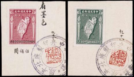 1947 Restoration of Taiwan $1,250 green imperf. colour proof, printed on white paper, stuck on grilled card, with