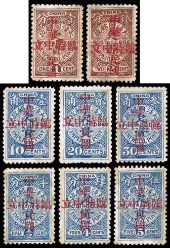 of 8, 1/2c, 4c, 10c, 20c & 30c part o.g. 1c, 2c, 5c no gum, very rare to form as a set. Chan DU5-6. With Experts &