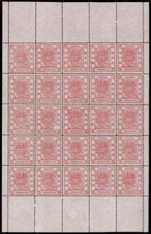 1878 Large Dragon thin paper, 3cds brown red, complete sheet of 25 (5 x 5). Setting I, pristine item, very fresh. Chan