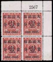 Large figures 1c on 3c block of 4 with sheet no. '2567',
